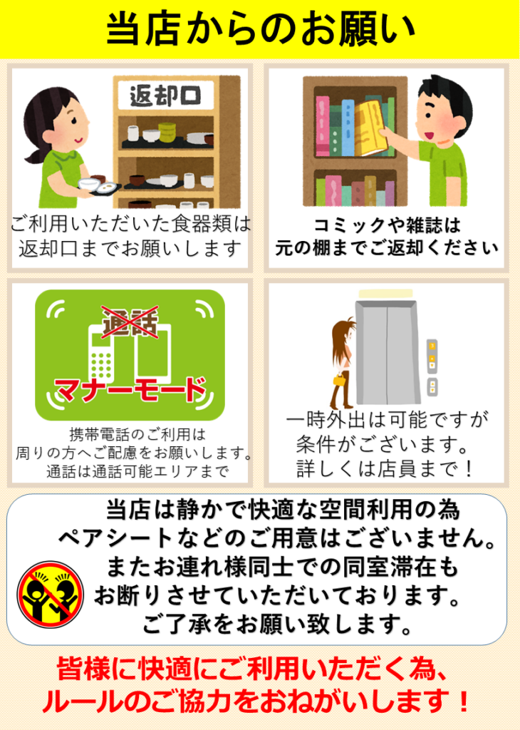- 店内での大声の会話や携帯電話の通話は他のお客様のご迷惑となります。最低限のマナーをお守リください。