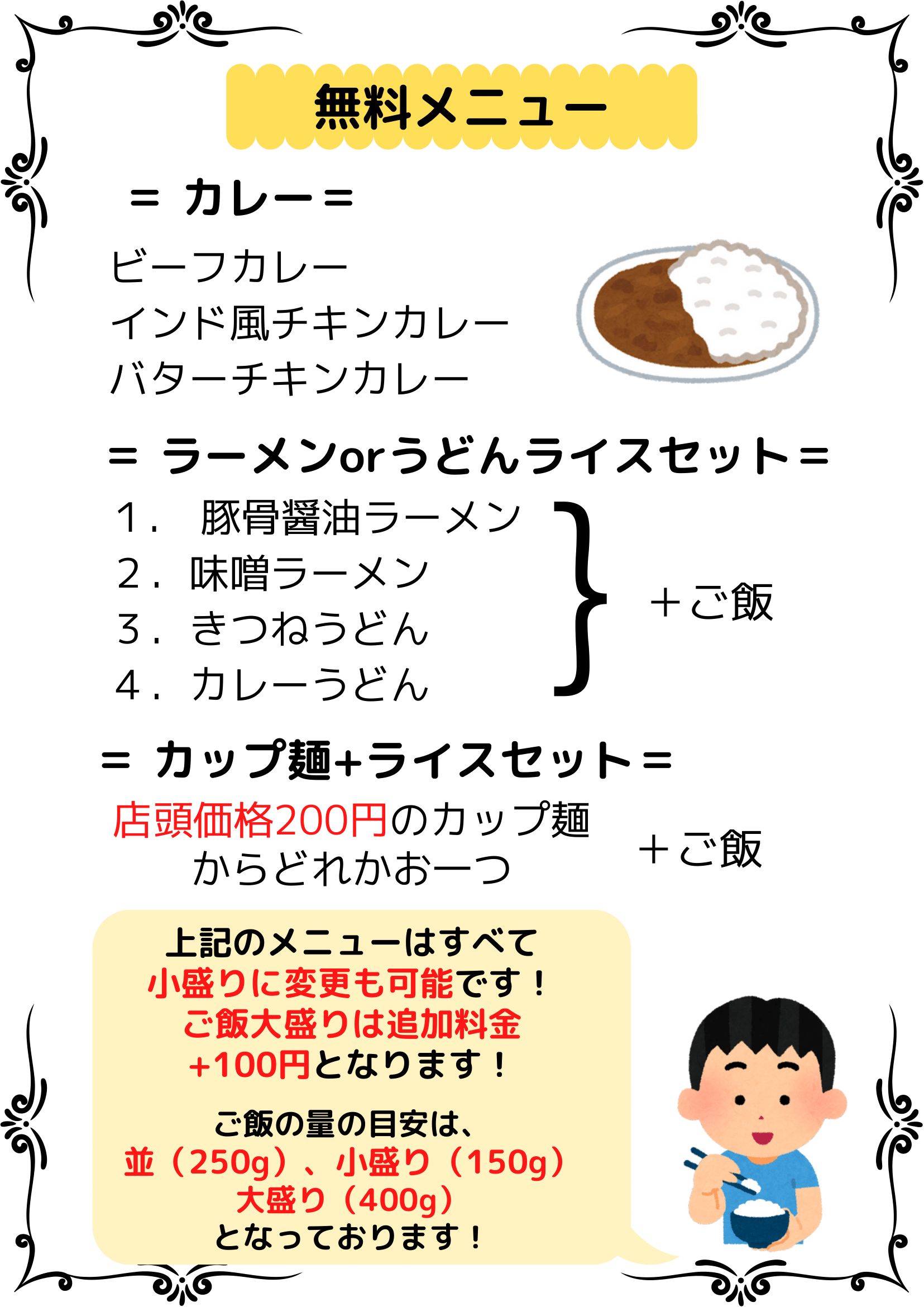 - 当店は飲食物の持込み自由ですが、匂いのきついものなどはお控えください。